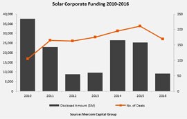 Mercom Capital集團首席執(zhí)行官兼聯(lián)合創(chuàng)始人Raj Prabhu評論道:“對于太陽能企業(yè)而言,今年是籌資充滿挑戰(zhàn)的一年,即使需求預期達到歷史新高。2017年可能比預期情況要好,因為組件價格降低預計將提升裝機量?!?