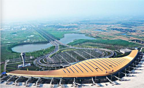 合肥新橋機(jī)場在2013年5月30日正式啟用,屋面采用金黃色的直立鎖邊鋁鎂錳合金面板,規(guī)律設(shè)置19排屋面采光天窗。俯視整個建筑,宛若金色的展翅大鵬在江淮分水嶺上昂首欲飛,既是一張代表合肥形象的新“名片”,也是安徽又一標(biāo)志性新景觀。該機(jī)場分布式光伏發(fā)電項目貫徹節(jié)能減排理念,在優(yōu)化能源系統(tǒng)運(yùn)行效率的同時,有效推動了合肥市“中國光伏應(yīng)用第一城”的構(gòu)建,促進(jìn)我國“綠色機(jī)場”的可持續(xù)發(fā)展。