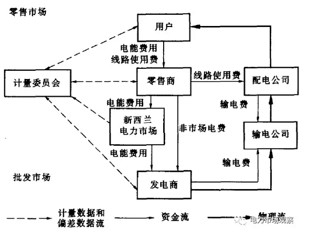 新西蘭電力市場由電力批發(fā)市場和配電競爭市場組成,實(shí)行一級現(xiàn)貨交易和二級期貨合約交易相結(jié)合的市場機(jī)制。受北島和南島間高壓直流電纜輸電容量的限制,在北島和南島分別設(shè)立不同的價(jià)區(qū)。運(yùn)轉(zhuǎn)流程上,發(fā)電商通過競爭把發(fā)出的電力賣給電力批發(fā)市場,市場把電力批發(fā)給購電商。通過零售市場,購電商再把批發(fā)到的電力賣給大小不等的終端用戶。