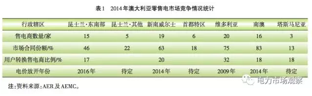 澳大利亞在全電力市場范圍內(nèi),所有大小用戶從2007年起都可以自主選擇其零售電商。目前的市場格局是,大多數(shù)居民用戶選擇大型零售電公司,顯示出其品牌效應。而小規(guī)模售電公司主要是為工商用戶提供服務。電力法規(guī)要求能源市場委員會按年度對各個行政州的零售市場競爭形勢進行評估。能源委員會根據(jù)多重標準評估零售電市場競爭是否“有效”??紤]的因素有:居民用戶對選擇權(quán)的知情程度,實施選擇權(quán)情況,零售業(yè)務進場、退場和擴展的難易程度。同時還考慮零售電價(落地價)的競爭力。如果能源市場委員會對一個州的評估是“競爭有效”,那么它則建議此州政府取消最高落地價的限制,即零售電價完全由市場競爭來確定。表1是有關(guān)澳大利亞零售電市場競爭情況的2014年統(tǒng)計數(shù)據(jù)。