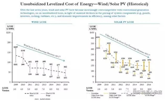 中國儲(chǔ)能網(wǎng)訊:美國咨詢公司Lazard每年評(píng)估美國各類能源發(fā)電的全生命周期平準(zhǔn)成本(LCOE),2016年12月15日公布了第10份報(bào)告。這份報(bào)告中的一幅圖表顯示了2009年以來美國風(fēng)電、光伏成本的下降趨勢。