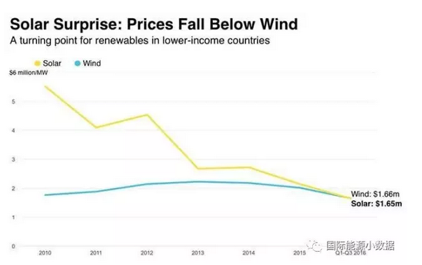 中國儲能網(wǎng)訊:人們常常把風(fēng)電光伏成本與常規(guī)能源相比,那么風(fēng)電和光伏本身成本相比是什么樣的情況呢?據(jù)彭博新能源財(cái)經(jīng)在包括中國、印度、巴西等58個發(fā)展中國家的調(diào)查統(tǒng)計(jì),截至2016年第三季度這些國家中太陽能光伏項(xiàng)目投資的平均報(bào)價(jià)為1.65美元/瓦,而風(fēng)電項(xiàng)目投資的平均報(bào)價(jià)為1.66美元/瓦。光伏投資成本僅在5年前還高出風(fēng)電2倍,現(xiàn)在首次略低于風(fēng)電,可謂是歷史的飛躍。