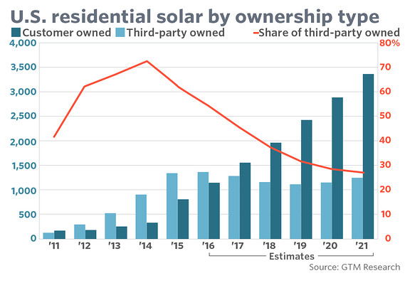 但是,SolarCity的這種模式可能無法再繼續(xù)運行下去。市場研究公司GTM Research預(yù)計,2017年,多數(shù)用戶將以現(xiàn)金或貸款的方式直接購買太陽能系統(tǒng)。GTM稱,租賃或第三方擁有的太陽能系統(tǒng)占據(jù)了今年太陽能系統(tǒng)市場的大約54%,明年將降至45%,未來5年內(nèi)將逐步降低至30%以下。