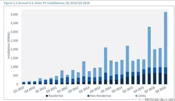 中國(guó)儲(chǔ)能網(wǎng)訊:美國(guó)第三季度光伏裝機(jī)達(dá)到4.143GW(其中加利福尼亞裝機(jī)超過(guò)1GW),相比今年第二季度增幅為99%,相比去年第三季度增幅高達(dá)191%。這是美國(guó)歷史上單季度光伏裝機(jī)容量最高紀(jì)錄,相當(dāng)于每32分鐘就有1兆瓦裝機(jī)竣工。2016年第一季度至第三季度,光伏裝機(jī)占全美新增電力裝機(jī)的39%,僅次于天然氣裝機(jī)增量。