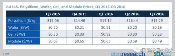 光伏組件成本也持續(xù)下降,2016年第三季度平均為0.49美元/瓦(相當(dāng)于人民幣3.4元/瓦)。