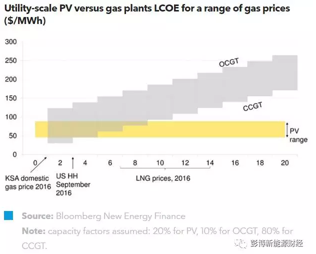 隨著光伏和風(fēng)電系統(tǒng)成本的不斷下降,再加上能源補(bǔ)貼改革的助力,MENA經(jīng)濟(jì)體必須面對(duì)一個(gè)新的可再生能源與經(jīng)濟(jì)發(fā)展環(huán)境?,F(xiàn)階段,光伏電廠的發(fā)電成本要低于天然氣進(jìn)口國(guó)內(nèi)的天然氣電廠(基本負(fù)荷運(yùn)行下的)成本。即使是在沙特阿拉伯等燃料價(jià)格補(bǔ)貼豐厚的國(guó)家,光伏仍是應(yīng)對(duì)峰值電力需求時(shí)最為經(jīng)濟(jì)的方式。