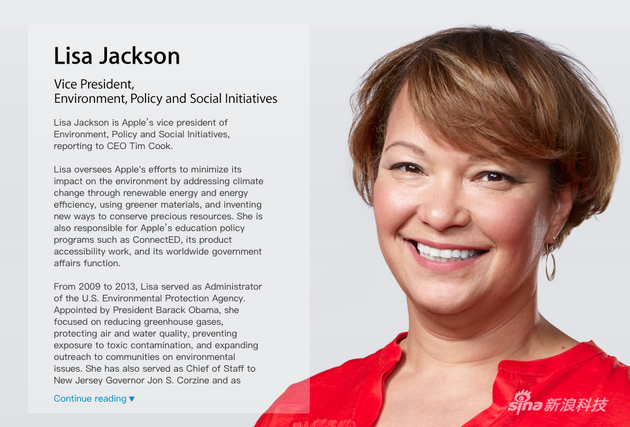 麗莎-杰克遜(Lisa Jackson)曾是奧巴馬總統(tǒng)的內(nèi)閣成員,美國國家環(huán)境保護(hù)局第十二任執(zhí)行長官(相當(dāng)于環(huán)保部部長),蘋果公司在2013年聘請她,擔(dān)任蘋果公司環(huán)境、政策、社會(huì)事務(wù)副總裁。