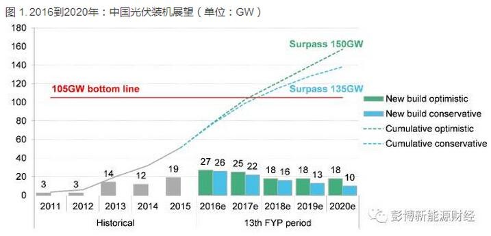 根據我們的項目數據庫,2016年能源局下發(fā)的23.82GW指標(含直轄市及西藏以外地區(qū)普通電站、領跑者項目、光伏扶貧和試點項目)當中,大約有6GW已經在2016年建成,意味著大約18GW會留到2017年上半年建成。加上不限指標的項目,以及明年630之后的裝機,我們預計2017年的新增裝機量將輕松突破20GW,可能達到25GW,即累積裝機接近103GW。這意味著,105GW的光伏“十三五”發(fā)展底線最早可能在2017年底到2018年初被突破。