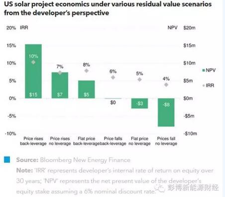 中國儲(chǔ)能網(wǎng)訊:在美國,越來越多的光伏項(xiàng)目是以短期承購合同的方式建設(shè)的,這樣就給合同到期后的殘余收入留下了更多的價(jià)值,而這些收入都是沒有事先約定價(jià)值的現(xiàn)金流。為了支持投資的合理性,許多美國的光伏設(shè)施開發(fā)商做出了過于樂觀、甚至可能犯了致命錯(cuò)誤的假設(shè)——認(rèn)為債務(wù)成本仍將保持低位,而且太陽能電力的實(shí)際價(jià)格將會(huì)長期上升。