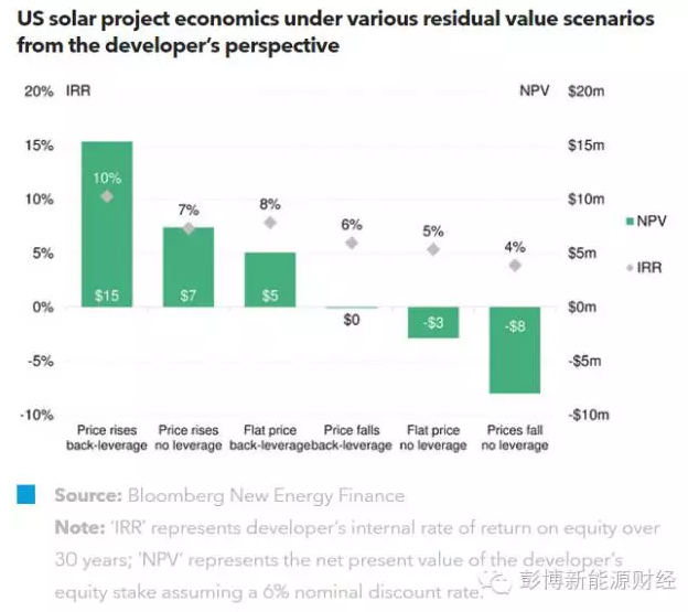 中國儲能網(wǎng)訊:在美國,越來越多的光伏項(xiàng)目是以短期承購合同的方式建設(shè)的,這樣就給合同到期后的殘余收入留下了更多的價(jià)值,而這些收入都是沒有事先約定價(jià)值的現(xiàn)金流。為了支持投資的合理性,許多美國的光伏設(shè)施開發(fā)商做出了過于樂觀、甚至可能犯了致命錯(cuò)誤的假設(shè)——認(rèn)為債務(wù)成本仍將保持低位,而且太陽能電力的實(shí)際價(jià)格將會(huì)長期上升。
