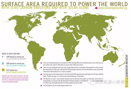 中國儲(chǔ)能網(wǎng)訊:如果到2030年全球能源需求全部靠光伏來滿足,那么得要占多大的面積來安裝光伏板?專門推動(dòng)可再生能源利用的國際非政府組織Land Art Generator Initiative做了這樣的計(jì)算: