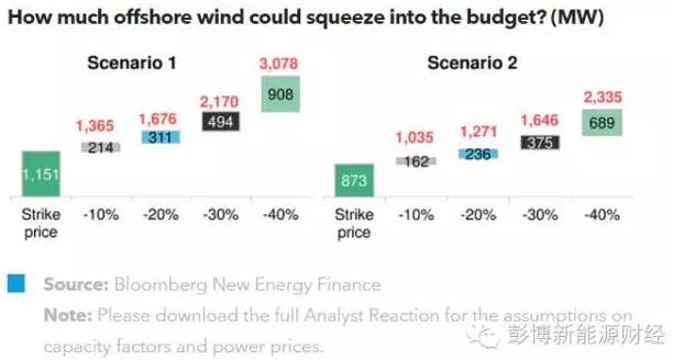 如果海上風(fēng)電能夠吞下整個(gè)預(yù)算,且投標(biāo)者均大膽出價(jià)(低于執(zhí)行價(jià)格40%),海上風(fēng)電技術(shù)有可能拿下3GW多一點(diǎn)容量(情景一)。但如果燃料發(fā)電技術(shù)拿到了最大份額,且沒(méi)有開(kāi)發(fā)商的出價(jià)低于執(zhí)行價(jià)格,那大約僅有873MW的海上風(fēng)電容量有機(jī)會(huì)拿到預(yù)算(情景二)。