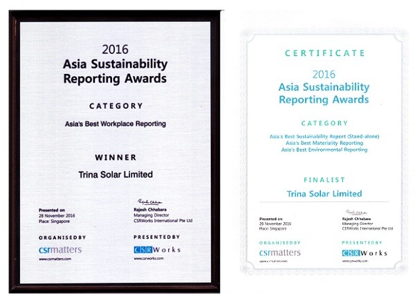 CSRWorks International總裁、亞洲可持續(xù)報告獎創(chuàng)始人Rajesh Chhabara說道,“可持續(xù)報告已經成為評估一家企業(yè)長期成功發(fā)展的重要指標,天合光能在此次2016年度評選中脫穎而出標志著他們在可持續(xù)報告領域的卓越領先,也代表了天合光能為所有的利益相關方創(chuàng)造長期價值的承諾?!?