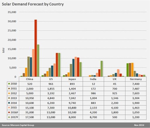 與此同時,Mercom Capital 也預(yù)測,2017 年全球光伏裝機(jī)量將保持在 70GW,比 2016 年將下降 8%,這和新能源媒體 GTM 的預(yù)測大致相當(dāng)。