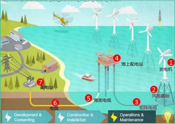 英國的風(fēng)電場的具體劃分(英國目前應(yīng)該是世界上Offshore Wind Farm 發(fā)展相對成熟的市場了)。如下圖所示: 整個風(fēng)電系統(tǒng)大致可以分為7個部分項目建成后,1-3歸項目開發(fā)商運營和維護,4-7歸OFTOs (Offshore Transmission Owners)運營和維護。