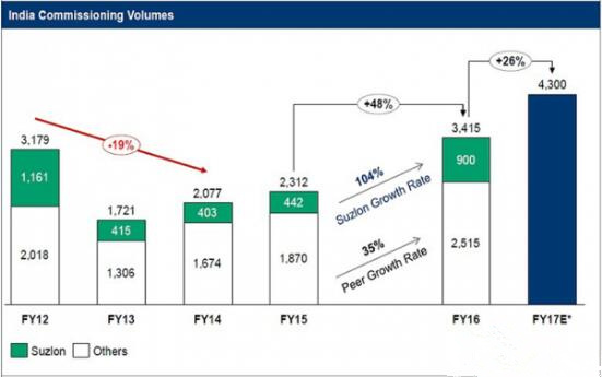 2015年4月29日,蘇司蘭出售其在德國(guó)風(fēng)機(jī)市場(chǎng)股份,到9月底,風(fēng)機(jī)訂單量急速上漲到1136MW,價(jià)值716.5億印度盧比。2015財(cái)年,蘇司蘭在印度風(fēng)機(jī)市場(chǎng)發(fā)展良好,裝機(jī)容量達(dá)到3400MW,預(yù)計(jì)到2017年可增長(zhǎng)30%。