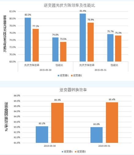 設(shè)備運(yùn)行效率:展示了太陽能電池陣列、匯流箱、逆變器的運(yùn)行效率:光伏方陣效率、性能比、逆變器轉(zhuǎn)換效率,如下圖,可實(shí)時(shí)反映關(guān)鍵光伏設(shè)備運(yùn)行效率。