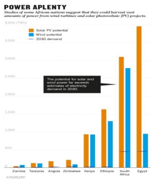 幾個(gè)因素促使非洲推動(dòng)可再生能源。該大陸三分之一以上的國(guó)家從水力發(fā)電廠獲得了大部分的電力,而過去幾年的干旱使得供應(yīng)不可靠。主要依賴化石燃料的國(guó)家受到價(jià)格波動(dòng)和不斷增加的法規(guī)的困擾。同時(shí),可再生能源技術(shù)的成本大幅下降。研究人員發(fā)現(xiàn),非洲大陸的太陽能和風(fēng)力發(fā)電量比以前認(rèn)為的多——目前總用電量的3700倍。