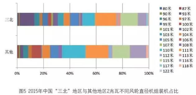 從圖5 可以看出,2015 年“ 三北”地區(qū)的2 兆瓦機(jī)組,裝機(jī)容量最大的是111 米風(fēng)輪直徑的產(chǎn)品,其次是115 米和110 米的產(chǎn)品。而華東、華中、華南、西南地區(qū)的2 兆瓦機(jī)組,裝機(jī)量最大的依次是110 米、111 米和115 米風(fēng)輪直徑的產(chǎn)品。從大的區(qū)域上看,2015 年“三北”地區(qū)的110米和116 米這兩種風(fēng)輪直徑的裝機(jī)比其他地區(qū)少,而93 米比其他地區(qū)多。風(fēng)輪直徑在110 米以上的2 兆瓦機(jī)型,在“三北”地區(qū)占比略超50%,在其他地區(qū)超過了65%。因此,2015 年在“三北”地區(qū)的安裝的2 兆瓦機(jī)型風(fēng)輪直徑相對于其他地區(qū)較小,這與風(fēng)資源情況有關(guān)。
