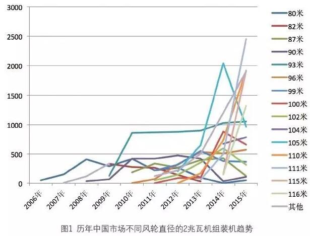 2006 年至2008 年,風(fēng)輪直徑為80 米的2 兆瓦機(jī)型,在2 兆瓦機(jī)組市場中占據(jù)明顯優(yōu)勢。2009 年,72 米與82 米的機(jī)型與80 米機(jī)型形成了市場主力,自2010 年開始,風(fēng)輪直徑93 米的2 兆瓦機(jī)組,開始占據(jù)市場中的大部分份額,其主體地位直至2014年被105 米機(jī)型所取代。2015 年,市場被多款機(jī)型所瓜分,很難說有某款機(jī)型比其他機(jī)型在市場上有特別明顯的優(yōu)勢。