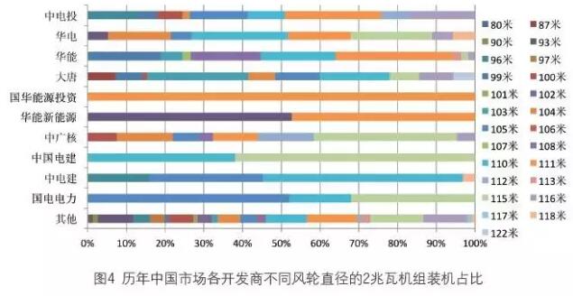 從歷年中國市場各開發(fā)商不同風(fēng)輪直徑的2 兆瓦機(jī)組的裝機(jī)占比中可以看出,2015 年中電投是安裝2 兆瓦機(jī)組最多的開發(fā)商企業(yè),其安裝的機(jī)組風(fēng)輪直徑規(guī)格較多,超過了9 種,以96 米、105 米、111 米、116 米最多。華電是2 兆瓦機(jī)型在2015 年裝機(jī)第二多的開發(fā)商,主要安裝了104米、110 米、111 米、115 米風(fēng)輪直徑的整機(jī)產(chǎn)品。華能是2 兆瓦機(jī)型在2015 年裝機(jī)第三多的開發(fā)商,安裝的2 兆瓦機(jī)組的風(fēng)輪直徑超過了9 種,以111 米的最多。