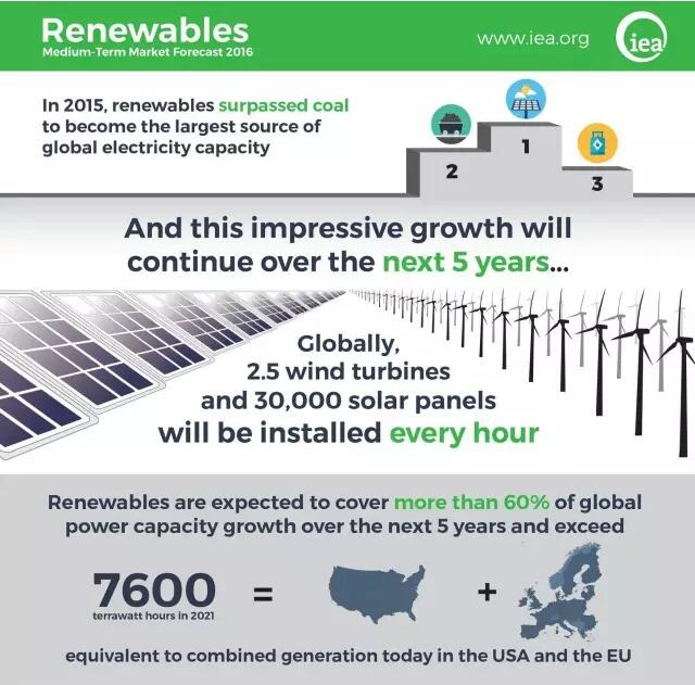 2015年,全球可再生能源發(fā)電裝機已經超過煤電、天然氣發(fā)電裝機。IEA預測未來5年(2016-2021)可再生能源將持續(xù)高速增長,預計裝機增量中超過60%都將來自可再生能源,全球平均每小時都有2.5座風機、3萬套光伏組件安裝,2021年全球可再生能源發(fā)電量可達7600TWh(7.6萬億千瓦時),大約相當于目前美國、歐盟的發(fā)電量,占2021年總發(fā)電量的28%。但是,可再生能源在供熱、交通領域發(fā)展相對滯后,2021年占相關市場的比例僅為10%和4%。