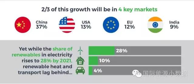 此外,未來5年可再生能源市場的三分之二集中在4個市場:中國(37%)、美國(13%)、歐盟(12%)、印度(9%)。