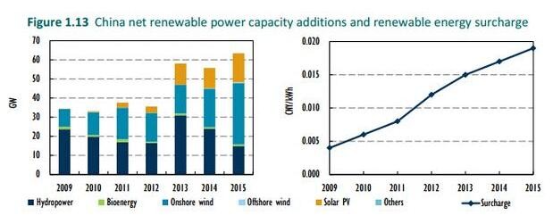 自2010年以來,中國已安裝非水能可再生能源超過16萬億瓦,這些安裝主要受到新能源補(bǔ)貼政策(Feed-in-Tarrif)的支持,旨在促進(jìn)可再生能源投資,并要求電力公司以固定成本購買太陽能光伏發(fā)電等綠色能源。