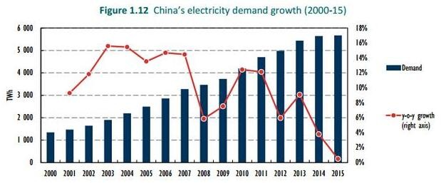IEA提供的相關(guān)圖表顯示,2015年,中國電力需求同比增長放緩;而5年前,中國電力需求同比增長超過12%。