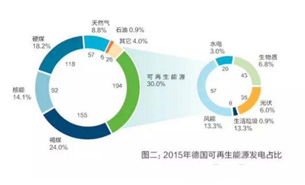 德國能源轉(zhuǎn)型成效卓著,2015年德國年發(fā)電總量達(dá)648太瓦時(shí),可再生能源發(fā)電194太瓦時(shí),占發(fā)電總比重的30%。其中尤以風(fēng)光發(fā)電為主,分別占比13.3%與6%。