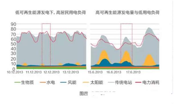 由于政策已制訂了未來可再生能源發(fā)電高比例增長的目標(biāo),而目前市場上低邊際成本的風(fēng)電光伏又能優(yōu)先并網(wǎng)發(fā)電,剩余需求負(fù)荷(residualload)于是成為影響電力市場設(shè)計(jì)的一個(gè)重要概念。它指除去風(fēng)光發(fā)電外、剩余發(fā)電組合所需承擔(dān)的電力需求量。圖四分別給出了冬夏季可再生能源發(fā)電量與剩余需求負(fù)荷間的普遍關(guān)系,夏季風(fēng)光發(fā)電多,需求總量較小,剩余需求負(fù)荷小;冬季反之。未來還可能出現(xiàn)兩種極端情況:1.最大剩余需求負(fù)荷:用電需求高,同時(shí)幾乎不產(chǎn)生風(fēng)能和太陽能,這可能發(fā)生在一個(gè)寒冷無風(fēng)的冬夜;2.最小剩余需求負(fù)荷:電力需求低,但同時(shí)產(chǎn)生大量風(fēng)能和太陽能發(fā)電,這可能發(fā)生在有風(fēng)和/或陽光明媚的周末或節(jié)假日。
