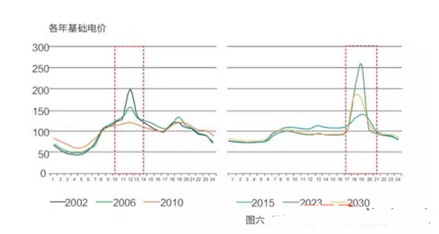 在傳統(tǒng)能源結(jié)構(gòu)下,用電高峰使峰值電價(jià)總是出現(xiàn)在每日10:00到14:00點(diǎn)之間,可達(dá)日平均電價(jià)的1.2至2倍。隨著越來越多風(fēng)能與太陽能的投入,傳統(tǒng)化石能源逐漸退出發(fā)電市場,電價(jià)波動更為頻繁劇烈。模擬結(jié)果顯示,午間時(shí)段10:00到14:00間的用電高峰恰也是未來太陽能發(fā)電高峰,隨著光伏的規(guī)模不斷擴(kuò)大,中午的電力供需矛盾將明顯緩解,這一時(shí)段的峰值電價(jià)曲線趨于平緩。傍晚時(shí)分太陽能發(fā)電大幅減弱直至為零,此時(shí)生活用能趨高,而傳統(tǒng)化石能源發(fā)電規(guī)模已經(jīng)削減,傍晚將出現(xiàn)全天的峰值電價(jià)。日內(nèi)電價(jià)峰值將由過去的雙峰變?yōu)槲磥淼膯畏?。?030年日峰值電價(jià)最多可達(dá)平均電價(jià)的2.5倍以上,同時(shí)夜間01:00到06:00點(diǎn)的谷期電價(jià)也有抬升:2002和2006年的最低谷期電價(jià)僅為日平均電價(jià)的二分之一,而從2015年起這一數(shù)字將提高到0.7左右。這樣的價(jià)格信息反映了綠色能源結(jié)構(gòu)對未來電力市場的影響??v向相比圖右2023年傍晚的峰谷價(jià)與日平均電價(jià)相比分別為2.6與0.7,大約是4倍。而到2030年,峰谷價(jià)差明顯縮小,這恰是2.0市場、需求側(cè)管理、儲能等多項(xiàng)因素發(fā)揮作用的結(jié)果。