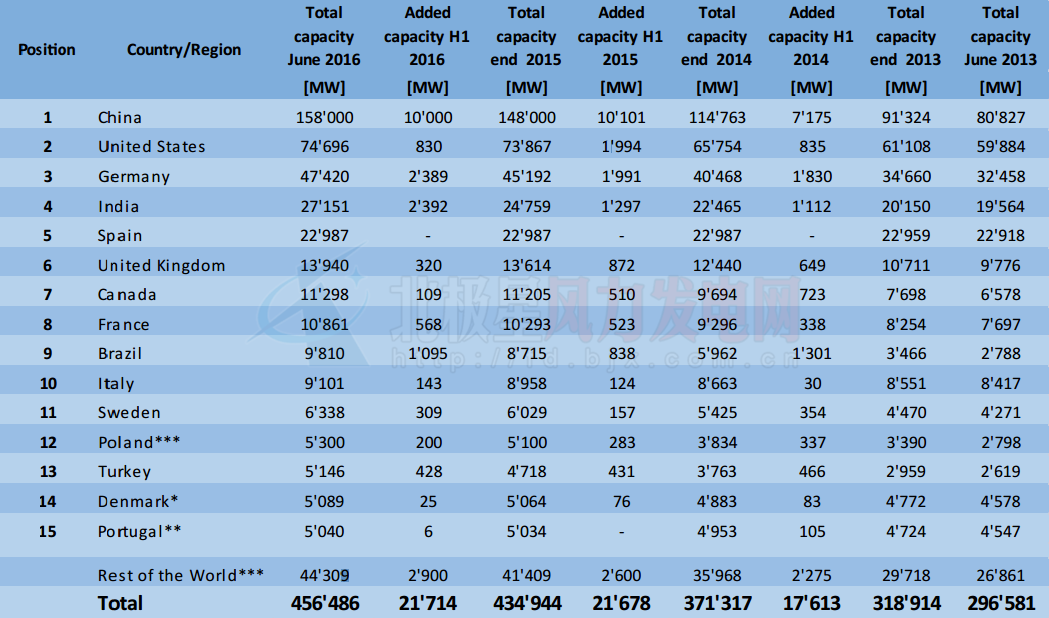 中國儲能網(wǎng)訊:全球風能理事會(WWEA)近日發(fā)布《WWEA 2016半年報告:全球風電裝機達456GW》,北極星風力發(fā)電網(wǎng)第一時間為您呈上完整報告數(shù)據(jù)。全球風電市場上半年新增裝機國家TOP10:中國、德國、印度、巴西、美國、法國、土耳其、英國、瑞典、波蘭。