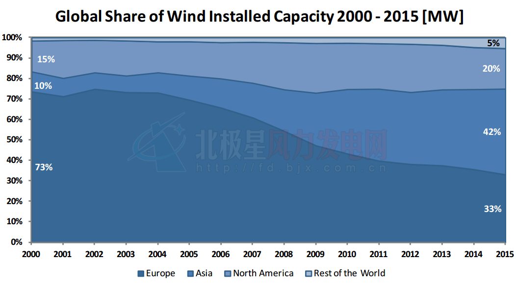 圖三 各地區(qū)風電裝機占全球市場份額2000—2015(MW)