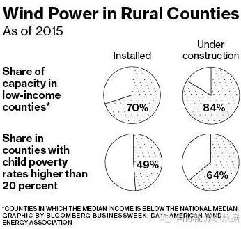 至2015年底,70%的風(fēng)電裝機(jī)建在了低收入地區(qū),而在建的裝機(jī)中這一比例更高達(dá)84%。過(guò)去種植玉米的農(nóng)民現(xiàn)在每年收入來(lái)自從為風(fēng)電場(chǎng)出租的土地租金,完全補(bǔ)償了玉米種植的收入,很多人自稱(chēng)是wind farmer(“風(fēng)農(nóng)”)。在全美范圍內(nèi),2030年農(nóng)村地區(qū)預(yù)計(jì)可從風(fēng)電上中收取9億美元的地租。