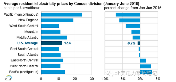 今年,大部分地區(qū)的居民用戶零售電價較去年有所下降。燃料價格下降,尤其是天然氣價格,可能是主要原因。2016年上半年,發(fā)電用天然氣的加權(quán)平均價格為2.58美元每百萬英熱單位,較2015年同期下降28%。