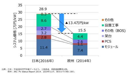 作為實(shí)現(xiàn)上述發(fā)電成本的系統(tǒng)費(fèi)用,建議草案提出了非住宅用2020年降至20萬日元/kW,2030年降至10萬日元/kW;住宅用途到2019年降至30萬日元/kW(相當(dāng)于售電價(jià)格為24日元/kWh),盡快降至20萬日元/kW(相當(dāng)于售電價(jià)格11日元/kWh)的參考目標(biāo)。日本光伏發(fā)電的現(xiàn)行系統(tǒng)費(fèi)用約為30萬日元/kW,是歐洲的2倍。