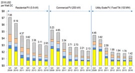 相比于2015年第四季度,2016年第一季度住宅、商業(yè)、和公用事業(yè)規(guī)模光伏行業(yè)成本分別下降6%、4%和20%。