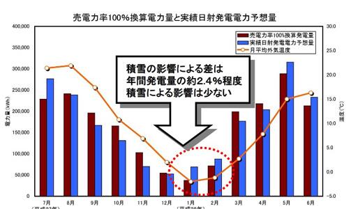 弘前市將按售電功率因數(shù)100%換算的值(實(shí)際功率因數(shù)為85%)與實(shí)際日照發(fā)電電力預(yù)測量的差視作降雪的影響而做了推算:實(shí)際發(fā)電量為165萬7700kWh,按售電功率因數(shù)100%換算的值為201萬3793kWh,實(shí)際日照發(fā)電電力預(yù)測量為201萬9749kWh,相差4萬8000kWh,只有年發(fā)電量的2.4%。