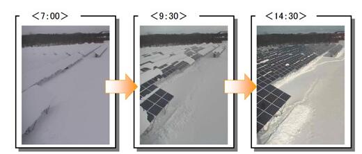 此次為實(shí)證而建設(shè)的百萬光伏電站,除了采用設(shè)置角為30度、設(shè)置高度為1.8m的耐積雪設(shè)計(jì)外,還將太陽能電池板組串(串聯(lián)電路)的接線按上段、中段、下段作水平連接,把下段有積雪時(shí)的損失降到了最低。另外,還利用監(jiān)控?cái)z像頭監(jiān)控和記錄積雪狀態(tài),視情況為電池板除雪。