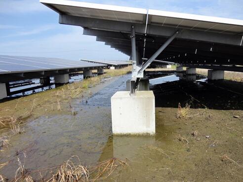 “香取市與田浦光伏電站”建設(shè)時(shí)的課題是應(yīng)對(duì)松軟的地基。由于地耐力較低,采用了設(shè)置了螺旋錨的承臺(tái)基礎(chǔ)。鋪了約50cm厚的液狀化沙土,利用振動(dòng)壓路機(jī)壓實(shí)。再以數(shù)十cm的深度固定模板,現(xiàn)場(chǎng)打混凝土基礎(chǔ)(圖5)。
