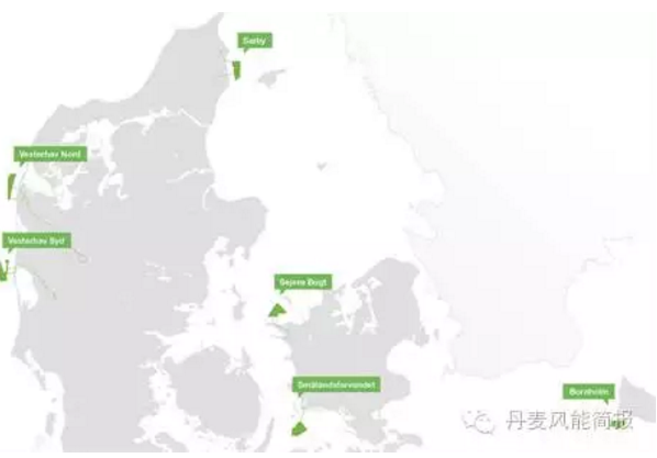 丹麥近海風(fēng)電項(xiàng)目共五個(gè)場址,共350MW,分別位于Vesterhav Nord, Vesterhav Syd, S?by, Sm?landsfarvandet, 和 Bornholm(原規(guī)劃如圖有六個(gè),今年4月份中部的場址Serejo Bugt已經(jīng)出局)。