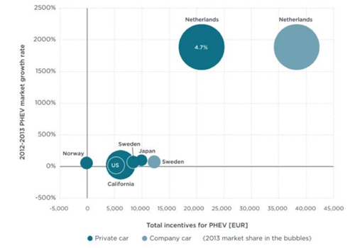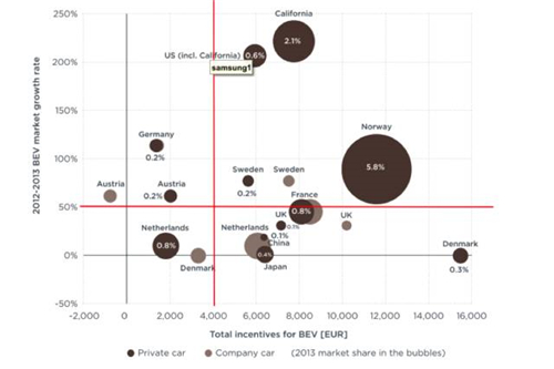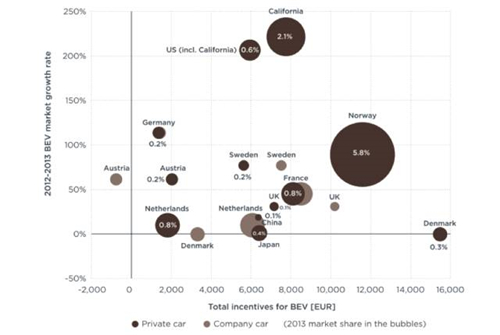 國家的財(cái)政補(bǔ)貼政策能夠有力拉動了電動汽車的增長。這一點(diǎn)主要表現(xiàn)在挪威、荷蘭等國:挪威對于純電動汽車的財(cái)稅激勵大約為11500歐元(相當(dāng)于機(jī)動車基礎(chǔ)價格的55%),其2013年市場份額為6%,相對2012年增長90%。同樣,荷蘭對于插電混合動力的財(cái)稅激勵大約為38000歐元(相當(dāng)于機(jī)動車基礎(chǔ)價格的75%),其2013年市場份額達(dá)5%,相對2012年增長1900%。