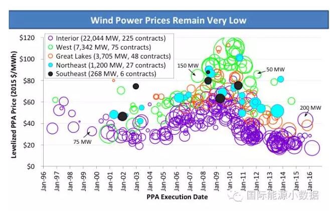 2009年風電的上網(wǎng)電價還在7美分/千瓦時,而最近竣工的美國風電項目的上網(wǎng)電價合同低至2美分/千瓦時,已成為成為成本最低的電源。