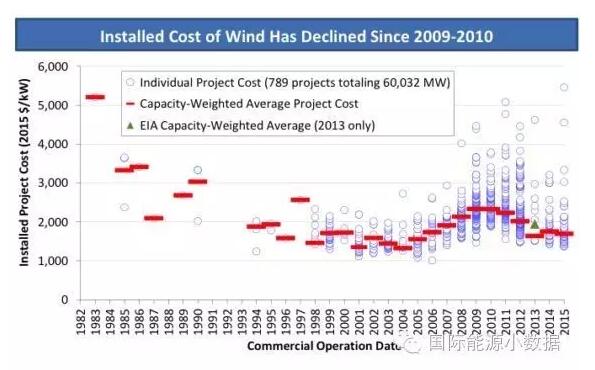 美國陸上風電成本創(chuàng)歷史新低,2015年風電平均裝機成本1690美元/千瓦,比2010年前后的高點下降了640美元/千瓦。