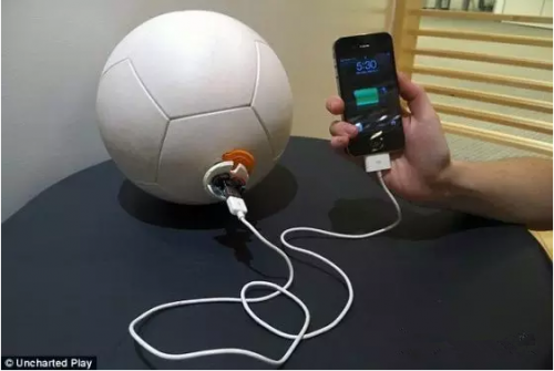球踢完了帶回家,揭開球上的揭蓋有一個(gè)USB接口能為電燈、手機(jī)、風(fēng)扇等低功率電器供電了。