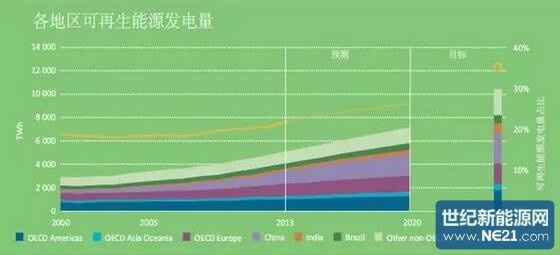 2015年,全球發(fā)電量增長(zhǎng)23%,其中可再生能源發(fā)電量增長(zhǎng)約5%。中國(guó)仍舊為可再生能源最大市場(chǎng),2015年中國(guó)可再生能源發(fā)電量占全球可再生能源發(fā)電量的23%,歐盟占17%,美國(guó)占11%。
