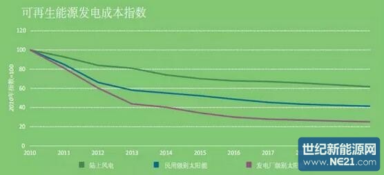 近年來,可再生能源發(fā)電成本,特別是風(fēng)能與太陽(yáng)能光伏發(fā)電呈大幅下滑趨勢(shì)。2010至2015年,全球新建風(fēng)能發(fā)電場(chǎng)成本平均下降30%,而新建太陽(yáng)能光伏發(fā)電廠成本則下降了65%。預(yù)計(jì)2015至2020年,陸上風(fēng)電場(chǎng)成本還將再下降12%,太陽(yáng)能光伏發(fā)電廠成本則會(huì)再下降25%。而對(duì)于海上風(fēng)電場(chǎng)建造成本來說,近幾年一直呈上漲趨勢(shì),這是因?yàn)榇蠖鄶?shù)海上風(fēng)電場(chǎng)的建設(shè)場(chǎng)地遠(yuǎn)離海岸線,導(dǎo)致造價(jià)上升。但近期,在丹麥和英國(guó)的投標(biāo)建設(shè)合同中顯示,2018至2020年海上風(fēng)電場(chǎng)的建設(shè)成本預(yù)計(jì)會(huì)比現(xiàn)在下降20%左右。