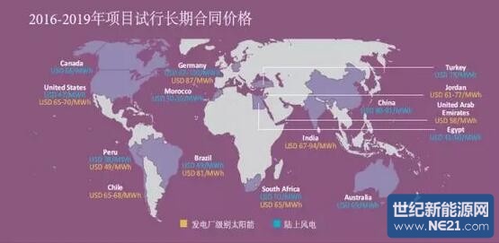 由于科學(xué)技術(shù)的提升、可再生能源市場(chǎng)的擴(kuò)大、融資條件的優(yōu)化,以及長(zhǎng)期購(gòu)電合同為基礎(chǔ)的價(jià)格競(jìng)爭(zhēng)模式的普及,可再生能源的效益近年來持續(xù)提升。據(jù)近期公布的長(zhǎng)期購(gòu)電利潤(rùn)回報(bào)合同顯示,可再生能源發(fā)電成本在未來幾年內(nèi)仍有下降的可能。目前,大多數(shù)國(guó)家新建陸上風(fēng)電場(chǎng)合同電價(jià)為60~80美金/MWh,最低的為50美金/MWh(如:巴西、秘魯、埃及等)。太陽(yáng)能光伏發(fā)電場(chǎng)合同電價(jià)為80~100美金/MWh(如:法國(guó)、德國(guó)和烏拉圭),最低的可達(dá)60美金/MWh(如:智利、秘魯、南非等)。