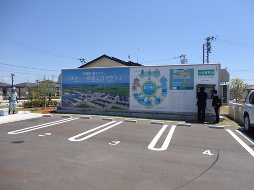 在東松島市柳之目北地區(qū)建設了85戶市營災害公營住宅。生態(tài)城設置了光伏發(fā)電設備(470kW)、定置式鉛蓄電池(480kWh)以及應急生物柴油發(fā)電機(500kVA,圖2、圖3)。即使供電網(wǎng)東北電力停電,也能維持數(shù)日正常水平的供電。